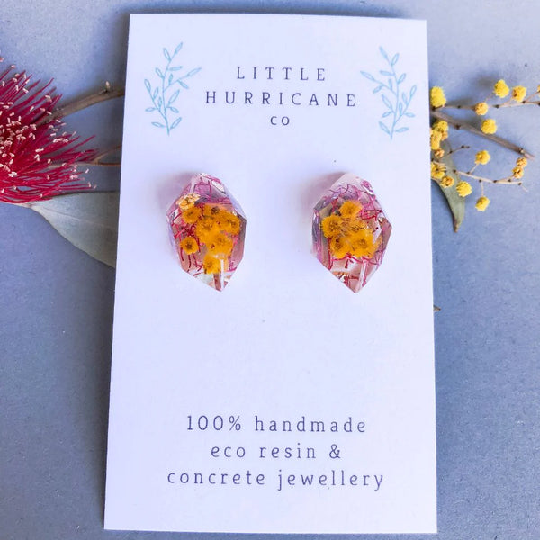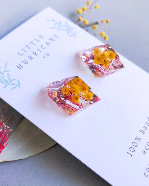 These handmade resin studs encase the happy yellow blossoms of Australia - the Golden Wattle and a pop of pink Gum blossoms.